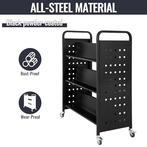 • Hasopy Library Book Cart 200LBS, Double Sided W-Shaped Rolling Book Cart with 4 Lockable Wheels for Home/Office/School, Movable Book Cart Black