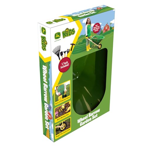 • John Deere Deluxe 34" Wheelbarrow and Garden Set Includes 5 Realistic Gardening Tools,Gardening Apron, Gardening Gloves, Large Metal Wheelbarrow with Wooden Handles, Outdoor Toy Ages 5+