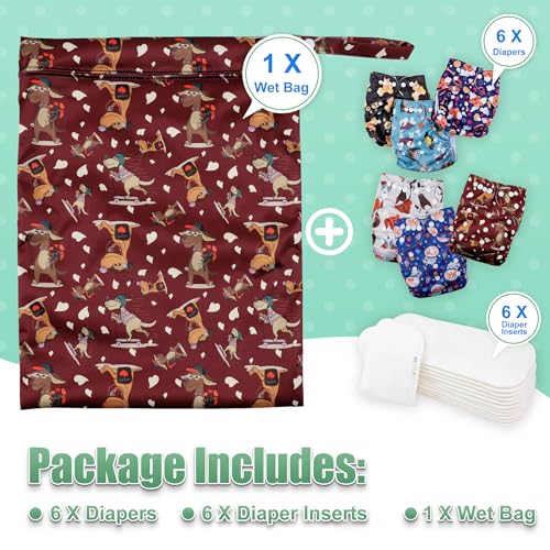 wegreeco Cloth Diapers 6 Pack with 6 Inserts & 1 Wet Bag, Washable Cloth Diapers for Babies, One Size Adjustable Reusable (Little Dogs)