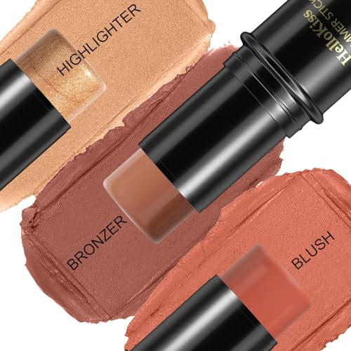 • 3 Pcs Face Contour Stick Kit, Matte Finish Face Stick Trio with Bronzer Blush Highlighter and Brush, Long Lasting Waterproof Cream Beauty Wand Makeup Set for Sculpt Glowing Face Look (#5, 6, 15)