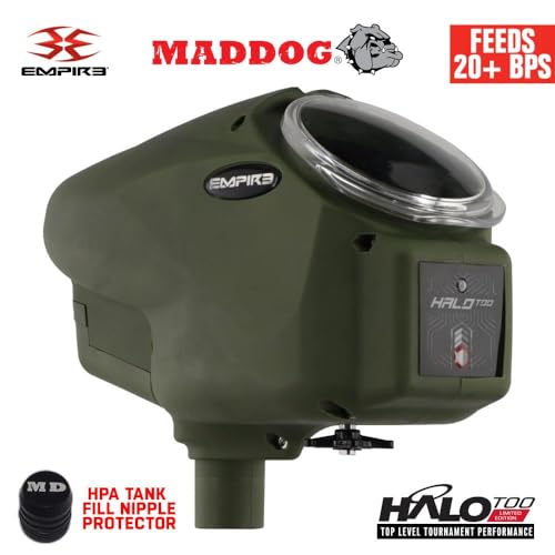 • Maddog Empire Halo Too Automatic Electronic Paintball Loader Hopper with HPA Paintball Tank Fill Nipple Protector | Feeds 20+ BPS | Limited Edition Matte Olive | No Speed Feed