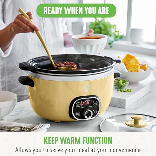 • GreenLife 6 Quart Ceramic Slow Cooker, PFAS-Free, Programmable, Removable Healthy Nonstick Pot for Family Meals, Sear on Stovetop, Keep Warm, Digital Timer, Dishwasher Safe Glass Lid & Crock, Yellow