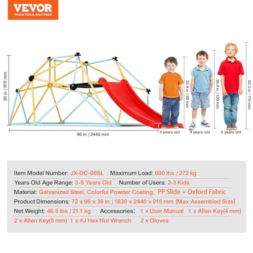 • VEVOR Climbing Dome, 8FT Geometric Dome Climber with Slide, Jungle Gym Supports 600LBS and Easy Assembly for Kids 3 to 9 Years Old, with Climbing Grip, Outdoor and Indoor Play Equipment for Kids