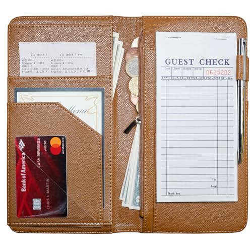 • Mymazn Server Book with Zipper and Magnetic Pocket, Cute Waitress Book Server Booklet, Guest Check Book Serving Book for Waitress Waiter Wallet Fits Server Apron with High Volume Pocket, Brown