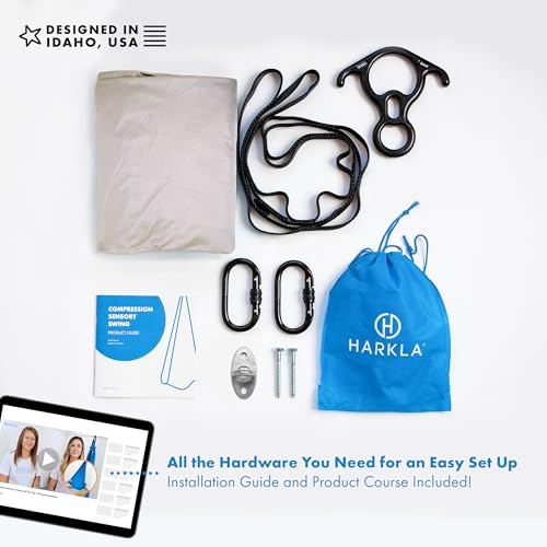 • Harkla Sensory Swing for Kids & Adults - Holds 300lbs, Indoor Outdoor Sensory Swing for Hug Like Calming Effect - Double Layered Soft Fabric and Heavy Duty Hardware (Grey, 110" Swing)