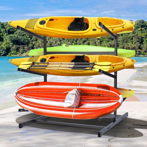 Morohope Freestanding Kayak Storage Rack - Heavy Duty Weatherproof Outdoor Tackle Storage With Hooks for SUP, Canoe, Paddleboard - 6 Levels, Black, 3 Levels for 6 Kayaks