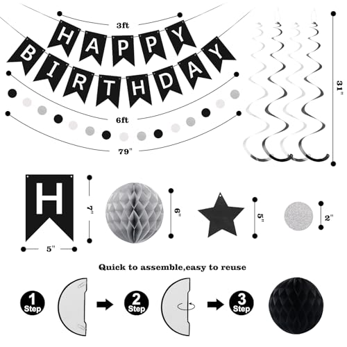 • meowtastic Birthday Decorations, Happy Birthday Banner with Honeycomb Balls, Star Hanging Swirl Streamer, Circle Dot Garland, Happy Birthday Party Decoration for Women Men Boys Girls (Black & Silver)