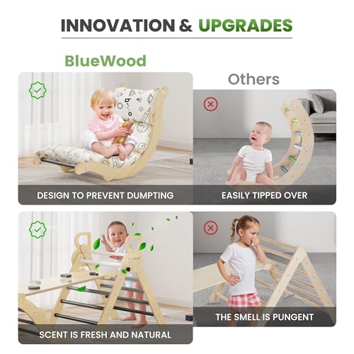 • BlueWood Pikler Triangle Set with Cushion, 8-in-1 Climbing Toys for Toddlers, Montessori Philosophy Play Jungle Gym with Arch, Ramp, Ladder(Elegant Gray)