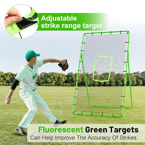 • 4×7ft Rebounder Net,Soccer Rebounder with Adjustable 5 Angles,6 Ground Stakes,1 Glove,Baseball Rebounder Net with Fluorescent Green Pitching Target,Net for Individual/Team Baseball Training