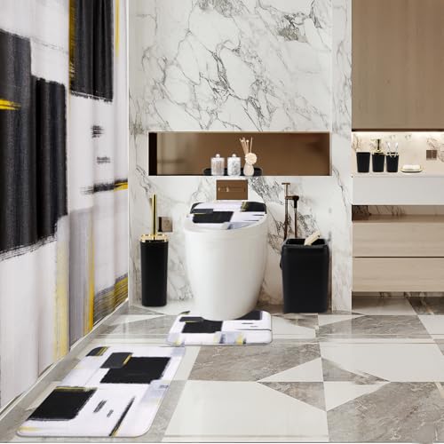 XLHOMO Bathroom Set - Black Bathroom Accessories Set, Bathroom Sets with Shower Curtain and Rugs, Black Shower Curtain Set with Bathroom Trash Can, Soap Dispenser, Soap Dish for Home Decor, Plaid Black & Gold, Complete Set + Bath Rugs