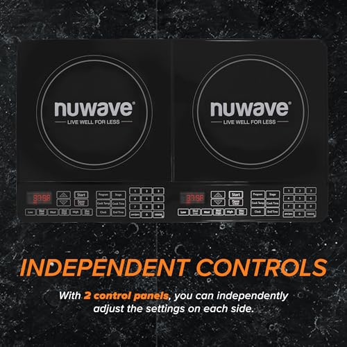 • Nuwave Double Cooktop Induction Countertop Burner, Portable, 900 & 1800W, 100°F to 575°F, Large 8” Heating Coil, 50 Pre-Programmed Settings, Shatter-Proof Ceramic Glass, Built-In Safety Auto Shut Off