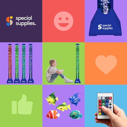 • Special Supplies Aquarium Sensory Fish Bubble Light Tube with 16 LED Color Changing Nightlight Effect, Remote Control, and 8 Fishes, Colorful Floor Standing Lamp for Kids and Adults (4 feet)