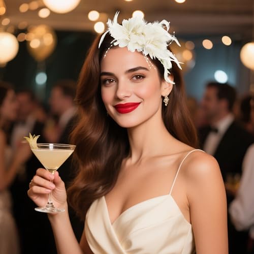 Pistha Womens Fascinators Hats Tea Party Hats for Women, Feather Pearl Veil Headband for Wedding Cocktail Dresses Accessories, Off-white, One Size