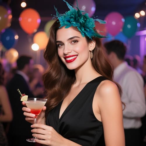 Pistha Womens Fascinators Hats Tea Party Hats for Women, Feather Pearl Veil Headband for Wedding Cocktail Dresses Accessories, Lake Blue, One Size