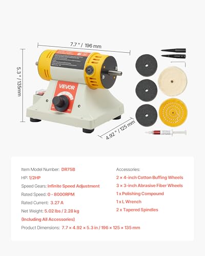 • VEVOR Bench Buffer Polisher, 1/2HP Polishing and Buffing Machine, 0 to 8000RPM Benchtop Polisher with 2PCS 4" Cotton Wheel, 3PCS 3" Abrasive Fiber Wheels & Polishing Compound for Metal Jewelry Wood