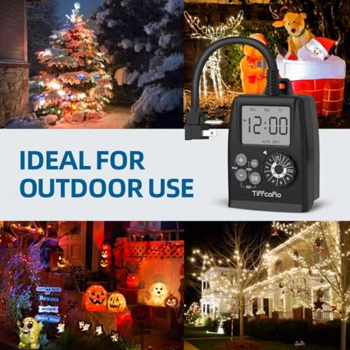 • TiFFCOFiO New Digital Outdoor Timer Outlet, Dial Programmable Method, Outdoor Light Timer Waterproof, 2 Grounded Electrical Outlets for Christmas Lights, 6 Sets of Programs, 15A/1875W (1 Pack)