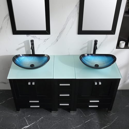 walnest 60" Double Wood Bathroom Vanity Set with Mirrors - Modern Combo with Round Tempered Glass Vessel Sinks, Chrome Faucets, and DTC Soft-Close Storage for Shared Bathrooms, Sink Blue&black, 60 inch