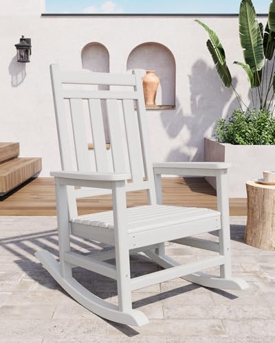 • GarveeLife Poly Lumber Rocking Chair Outdoor Set of 2 with Side Table - HDPE High Back Porch Rocker Chairs for Adults - All Weather Resistant Furniture for Patio - White