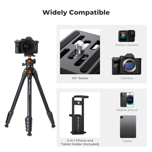 • K&F CONCEPT 63" Aluminum Travel Tripod for Camera w Phone Holder, Non-Reversible Lightweight Compact Tripod Weighs 2.6lb, Max Load 22lb for Camera DSLR Mirrorless Spotting Scope Camcorders Phone