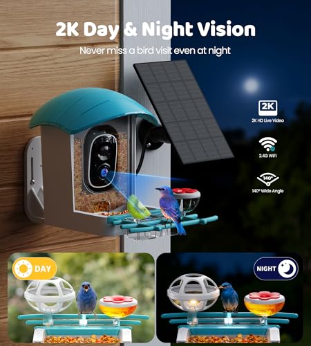 • Bird Feeder with Camera Solar Powered: Smart Bird Feeders for Outdoors Garden with AI Identify Auto Capture 2K HD Bird House with Camera Outside WiFi Live View Birdfeeder Cam Gift for Birds Lover