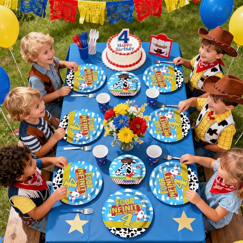 • 96 Pcs Toy Cartoon Story 4th Birthday Decorations Reach Four The Sky Plates and Napkins Disposable Toy Inspired Story Cartoon Theme Tableware Set for 4 Years Old Boys Birthday Party Supplies Serves 24