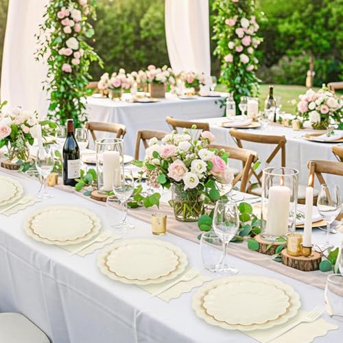 • 96 Pcs Beige Paper Plates and Napkins Party Supplies Ivory Disposable Dinnerware Set Include Scalloped Plates Paper Napkins Forks for Baby Shower Bridal Shower Wedding Birthday