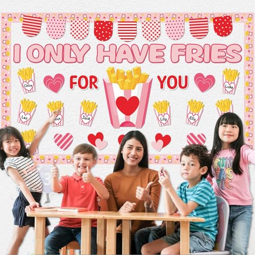 • party greeting Valentine's Day Fries Bulletin Board Set Valentines I Only Have Fries for You Classroom Decor Love Heart Name Border Trims Paper Cutouts for School Classroom Home Wall Decor Supplies