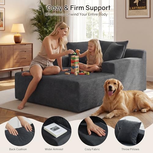 GRUSIGN 66" Chaise Lounge Chair Indoor, Oversized Boneless Lounge Chair with 3 Pillows, Corduroy Cloud Reading Chair for Living Room Bedroom, Deep Seat Sleeper Couch, No Assembly Required, Grey, 66inch