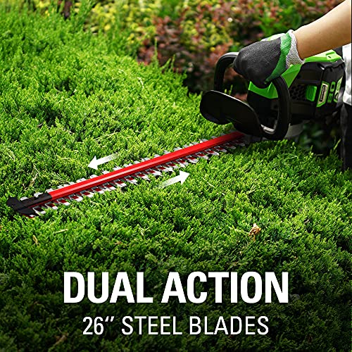 greenworks Pro 80V System offers a range of commercial grade tools for the professionals and those who just want more power. Rib through miles of hedges without the vibration and fumes from a gas engine. With a 26-inch dual action steel blade and anti-jam technology, you can get up to 60 minutes of run time with a fully charged 2ah battery. The brushless motor delivers greater torque and durability with a variable speed trigger offering up to 3000 SPM and 3/4-inch cut capacity. With an extra battery on hand, you can switch from one tool to the next and complete your job without the hassle of gas. Compatible batteries currently include a 2ah (model GBA80200) and 4ah (model GBA80400) battery and rapid charger (model GCH8040). The 2ah battery charges within 30 minutes so you can get back to work and finish that job. The 4ah battery charges within 1 hour.