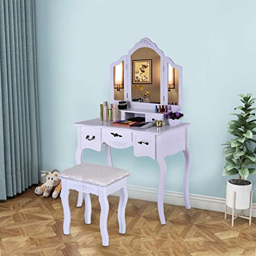 • [US in Stock] Vanity Table Set with 5 Drawers Tri-Folding Mirror Makeup Dressing Table with Vanity Cushioned Stool,Bedroom Vanity Table with Necklace Hooks&Brush Holder for Girls/Women (White)