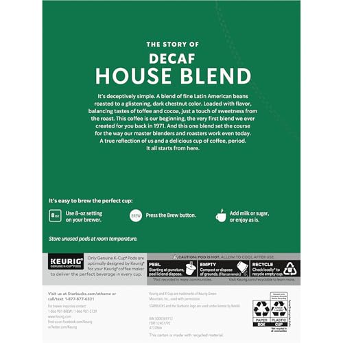 • Starbucks K-Cup Coffee Pods, Medium Roast Coffee, Decaf House Blend for Keurig Coffee Makers, 100% Arabica, 1 box (22 pods)