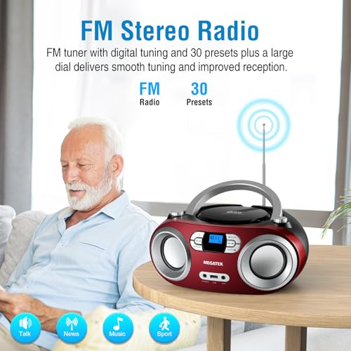 • MEGATEK Portable CD Player Boombox with FM Radio, Bluetooth, USB Port, AUX Input, and Headphone Jack – CD-R/CD-RW/MP3-CD Compatible, Clear Stereo Sound, Backlit LCD Display – Cherry Red