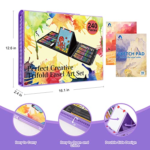 • VigorFun Art Supplies, 240-Piece Drawing Art Kit, Gifts for Girls Boys Teens, Art Set Crafts Case with Double Sided Trifold Easel, Includes Sketch Pads, Oil Pastels, Crayons, Colored Pencils (Purple)