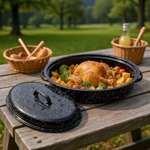 Granite bowl 15"Oval Roasting Pan With Lid Small Chicken Roaster With 13.7in Inner Diameter Enamel Steel Roasting Pot Suitable for Outdoors Family Dinnerhigh Temperature Resistance Holiday Gifts, Black, 15inch