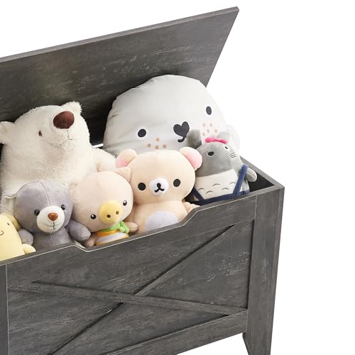 • VECELO 43.3" Storage Chest with Lift Top Storage, Farmhouse Style Ottoman with Handwoven Wicker Cushion, Safety Hinges, Ideal for Entryway, Bedroom, Living Room, Coal Gray