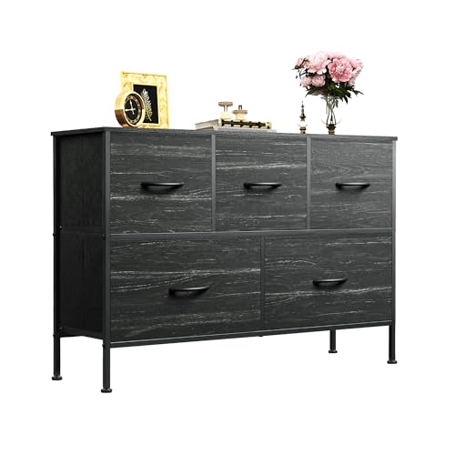 • WLIVE Dresser for Bedroom with 5 Drawers, Long Storage Dresser, Fabric Dressers, Storage Drawer Unit with Fabric Bins for Closet, Hallway, Charcoal Black Wood Grain Print, Size L