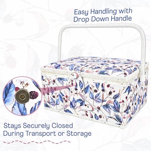 Comfecto Large Sewing Basket Wooden Vintage Box with Sewing Supplies Removable Tray, Built-in Pin Cushion Interior Pocket, Blue Red Floral, Berry Vine